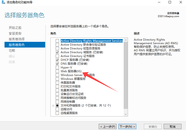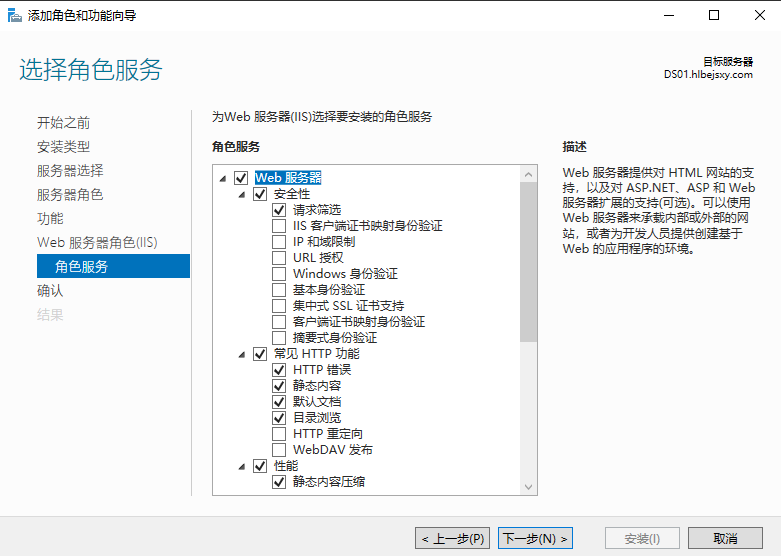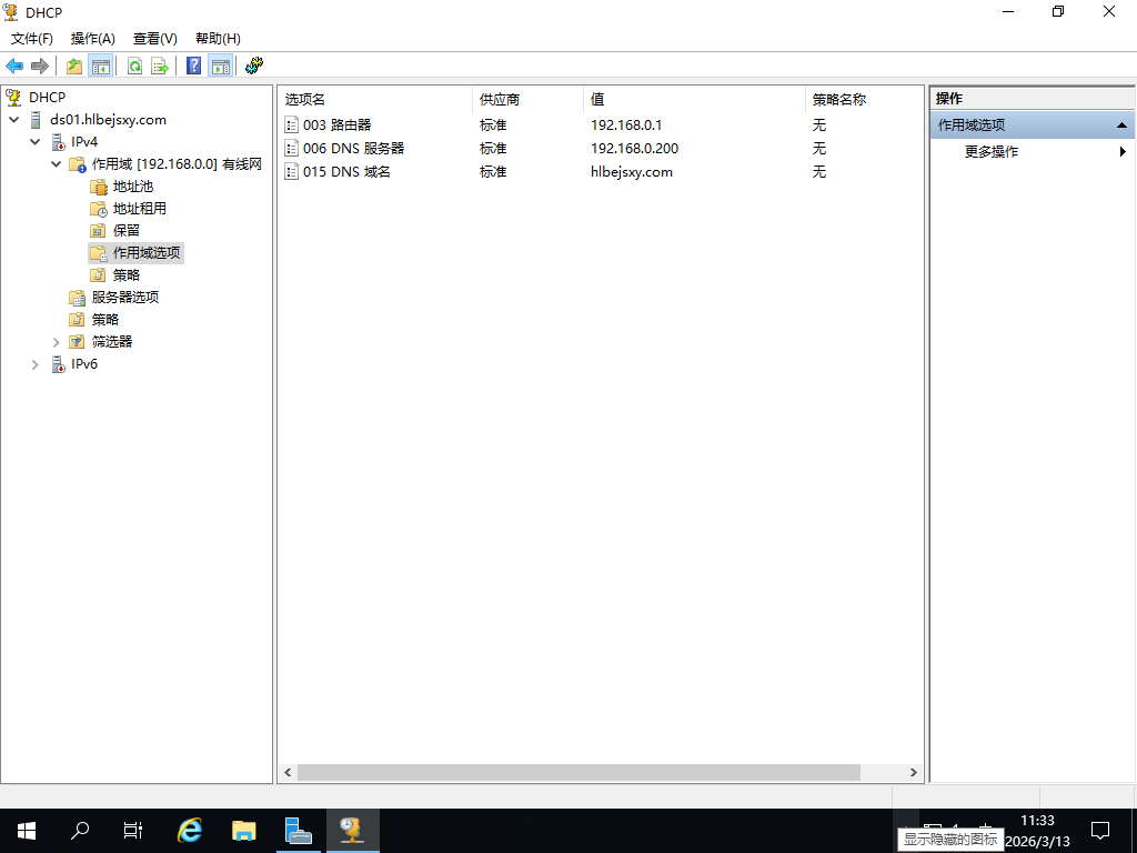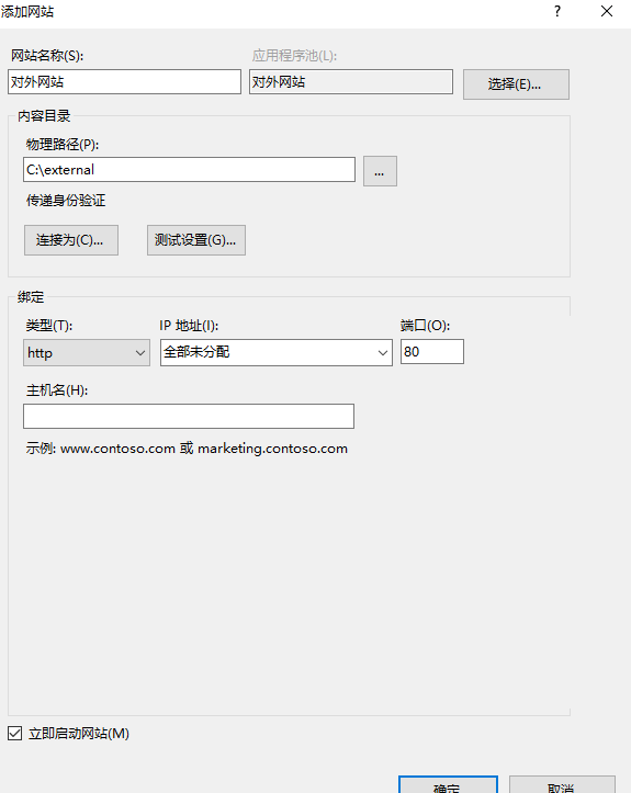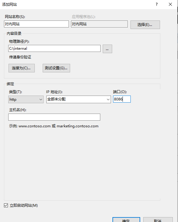 Windows服务器管理高级工鉴定 作者: aixiaxue 时间: 2026-03-13 分类: 高级工鉴定试题讲解 阅读 115次 #试题 任务要求(考试时间180分钟),印虚拟机消耗计算机资源过多,请关闭不必要的软件: 1.使用VM软件,安装Windows服务器,要求虚拟机内存为4G,虚拟机CPU为4核心,镜像位置在考试机F盘下,镜像文件名为:cn_windows_server_2019_x64_dvd_4de40f33.iso。 2.设置服务器IP地址为192.168.0.200/24,默认网关192.168.0.1,DNS地址192.168.0.200 和 202.99.224.67;设置服务器主机名为DS01 3.安装 Active Directory 域服务,创建新林,域名为 hlbejsxy.com;创建AD域用户组finance、admin、sales,每个组创建1个用户finance1、admin1、sales1,要求finance1用户工作日早8点至晚6点登录、admin1无登录要求、sales1用户工作日全时间登录。 4.为虚拟机添加一块20GB的新硬盘,完成分区、格式化与盘符分配。初始化新磁盘,选择GPT分区形式,创建三个分区,分别为主分区10GB,NTFS 文件系统,驱动器号 E,分区标签为 "Data";逻辑分区5GB,NTFS 文件系统,驱动器号 F,分区标签为 "Logs";剩余空间分区FAT32 文件系统,驱动器号 G,分区标签为 "Backup"。 5.安装DHCP服务器角色,根据表格添加DHCP内容  6.安装DNS创建一个名为“hlbejsxy.com”的正向查找区域,用于将域名解析为IP地址;同时,根据网络ID“192.168.0”,创建反向查找区域“0.168.192.in-addr.arpa”,用于将IP地址解析为域名。在正向查找区域中,添加主机记录,主机名为DNS,IP地址为192.168.0.200;在反向查找区域中,创建一个别名记录,别名为“web”,目标主机为“www.hlbejsxy.com” 7.通过服务器管理器添加IIS服务器角色,以搭建Web服务环境。安装完成后,配置对外网站:监听端口:80;网站根目录:C:\external;放置对外网站的静态页面(如 index.html,内容为“欢迎访问我的网站!此网站端口为80”);配置对内网站:监听端口:8086;网站根目录:C:\internal;放置对内网站的静态页面(如 index.html,内容为“欢迎访问我的网站!此网站端口为8086”)。 #操作 ##安装Windows服务器 1、新建虚拟机  2、选择【自定义安装】  3、下一步  4、选择【稍后安装】  5、选择【Microsoft Windows】,【Windows Server 2019】  6、修改虚拟机存储位置 切记 不要保存在C盘  7、选择【UEFI】启动模式  8、修改CPU数量为【4】  9、修改内存为【4G】  10、网络模式选择默认【NAT】即可  11、I/O控制器选项,默认即可  12、硬盘类型,保持和真机一致,选择【SATA】  13、磁盘文件,默认即可  14、磁盘大小,默认【60G】  15、下一步  16、完成  17、编辑虚拟机设置,将镜像文件加载到DVD光驱中,开机启动虚拟机  18、在开机界面快速切换到虚拟机界面,随意按键进入DVD安装系统  19、下一步  20、下一步  21、选择【我没有产品密钥】  22、选择安装版本, 切记要选择【桌面体验】版  23、同意许可,下一步  24、选择【自定义:仅安装Windows】  25、磁盘选择【新建】,点击【应用】   26、下一步  27、开始安装系统,系统会自动重启  28、输入并确认密码  29、通过虚拟机按钮,输入Ctrl+Alt+Del,输入密码进入系统  ##操作内容 ###试题内容:设置服务器IP地址为192.168.0.200/24,默认网关192.168.0.1,DNS地址192.168.0.200 和 202.99.224.67;设置服务器主机名为DS01 1、右键屏幕右下角【网络】图标,点击【打开网络和Internet设置】  2、点击【更改适配器选项】  3、右键【网卡】选择【属性】  4、双击【TCP/IP4】  5、根据题目要求,输入IP地址内容,点击确定  6、在【服务器管理】页面,点击【本地服务器】,点击计算机名  7、点击【更改】  8、根据题目要求,输入计算机名,并重启服务器   ###试题内容:安装 Active Directory 域服务,创建新林,域名为 hlbejsxy.com;创建AD域用户组finance、admin、sales,每个组创建1个用户finance1、admin1、sales1,要求finance1用户工作日早8点至晚6点登录、admin1无登录要求、sales1用户工作日全时间登录。 ####域安装 1、在【服务器管理器】,点击【添加角色和功能】  2、下一步  3、下一步  4、下一步  5、选择【Active Directory域服务】,默认添加功能,下一步   6、下一步  7、下一步  8、点击【安装】  9、完成之后点击【关闭】  10、点击【提示】,选择【将此服务器提升为域控制器】  11、根据题目要求,点击【添加新林】,输入题目要求域名  12、设置还原密码  13、下一步  14、下一步  15、下一步  16、下一步  17、点击安装,重启服务器   ####域用户管理 1、在【服务器管理器】,右上角【工具】【Active Directory 用户和计算机】  2、展开域,右键【Users】,新建【组】  3、根据题目要求,输入组名,并同样操作新建其他2个组  4、右键【Users】,新建【用户】  5、根据题目要求,输入用户名,并创建密码,并同样操作新建其他2个用户   6、在用户列表,双击新建的用户  7、点击【隶属于】选项卡,点击【添加】  8、输入组名,点击【检查名称】,点击确认  9、用于加入组中,点击确定  10、同样操作将另外2个用户加入组中 11、双击finance1账户,点击【账户】【登录时间】  12、点击【全部】,点击【全部拒绝】,先将登录时间清空  13、在根据题目要求,设置finance1用户工作日早8点到晚6点允许登录 注意下方有时间提醒 点击确定完成设置  14、根据任务要求,同样操作另外2个用户   ###试题内容:为虚拟机添加一块20GB的新硬盘,完成分区、格式化与盘符分配。初始化新磁盘,选择GPT分区形式,创建三个分区,分别为主分区10GB,NTFS 文件系统,驱动器号 E,分区标签为 "Data";逻辑分区5GB,NTFS 