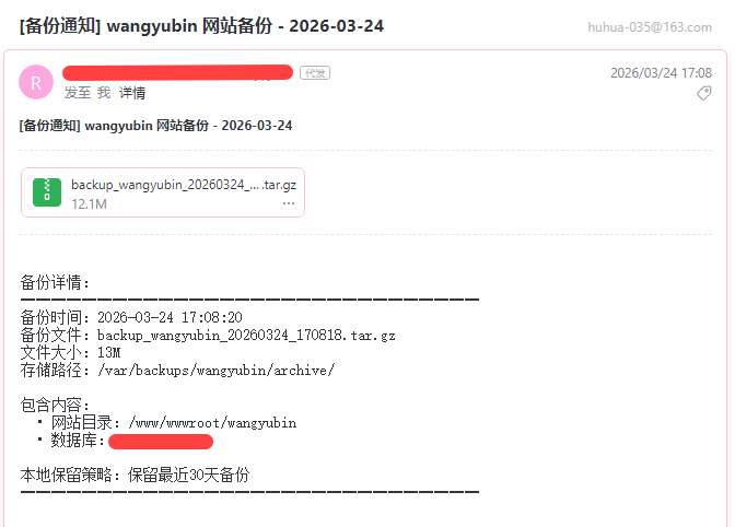 为服务器添加自动备份功能 作者: aixiaxue 时间: 2026-03-25 分类: 建站心得 阅读 38次 #任务内容: 为自己的网站服务器添加自动备份功能,每周一的凌晨3点自动执行脚本 #任务要求: 1、将网站目录、数据库进行备份,备份到/var/backups 2、备份内容存到服务器一份,另外再通过邮件发送给自己一份 3、将超过30天的备份自动删除 #实施过程: ##创建备份文件夹 ```bash # 创建规范的备份目录 sudo mkdir -p /var/backups/wangyubin/{web,database,logs} sudo mkdir -p /var/backups/wangyubin/archive # 设置权限(仅root可读写,防勒索病毒) sudo chown -R root:root /var/backups/wangyubin sudo chmod -R 700 /var/backups/wangyubin ``` ##创建备份脚本 ###创建脚本并编辑 ```bash vim /usr/local/bin/backup_wangyubin.sh ``` ###脚本内容 ```bash #!/bin/bash # ============================================ # 网站与数据库定时备份脚本 # 备份路径:/var/backups/wangyubin/ # 定时任务:每周一凌晨3点执行 # ============================================ # 配置变量 BACKUP_BASE="/var/backups/wangyubin" WEB_DIR="/www/wwwroot/wangyubin" DB_NAME="数据库名称" #替换成你的数据库名称 DB_USER="数据库用户" #替换成你的数据库用户 DB_PASS="数据库密码" #替换成你的数据库密码 DATE=$(date +%Y%m%d_%H%M%S) WEEK_DAY=$(date +%u) # 1=周一 # 邮件配置(需修改为你的邮箱) EMAIL_TO="your-email@example.com" EMAIL_FROM="your-email@example.com" # 创建临时目录 TEMP_DIR="$BACKUP_BASE/temp_$DATE" mkdir -p "$TEMP_DIR" echo "========== 备份开始:$(date) ==========" # ---------- 1. 备份网站目录 ---------- echo "[1/6] 正在备份网站目录..." WEB_BACKUP="$TEMP_DIR/web_wangyubin_$DATE.tar.gz" tar -czf "$WEB_BACKUP" -C "$(dirname $WEB_DIR)" "$(basename $WEB_DIR)" 2>/dev/null if [ -f "$WEB_BACKUP" ]; then WEB_SIZE=$(du -h "$WEB_BACKUP" | cut -f1) echo " ✓ 网站备份完成: $WEB_SIZE" else echo " ✗ 网站备份失败" exit 1 fi # ---------- 2. 备份数据库 ---------- echo "[2/6] 正在备份数据库..." DB_BACKUP="$TEMP_DIR/db_${DB_NAME}_$DATE.sql" # 使用mysqldump备份(适用于MySQL/MariaDB) mysqldump -u"$DB_USER" -p"$DB_PASS" --single-transaction --quick --lock-tables=false "$DB_NAME" > "$DB_BACKUP" 2>/dev/null # 压缩数据库备份 gzip -f "$DB_BACKUP" DB_BACKUP="${DB_BACKUP}.gz" if [ -f "$DB_BACKUP" ]; then DB_SIZE=$(du -h "$DB_BACKUP" | cut -f1) echo " ✓ 数据库备份完成: $DB_SIZE" else echo " ✗ 数据库备份失败" exit 1 fi # ---------- 3. 打包合并 ---------- echo "[3/6] 正在打包合并..." FINAL_BACKUP="$BACKUP_BASE/archive/backup_wangyubin_$DATE.tar.gz" tar -czf "$FINAL_BACKUP" -C "$TEMP_DIR" . if [ -f "$FINAL_BACKUP" ]; then FINAL_SIZE=$(du -h "$FINAL_BACKUP" | cut -f1) echo " ✓ 总备份包: $FINAL_SIZE" else echo " ✗ 打包失败" exit 1 fi # ---------- 4. 发送邮件 ---------- echo "[4/6] 正在发送邮件..." # 生成邮件内容 MAIL_SUBJECT="[备份通知] wangyubin 网站备份 - $(date +%Y-%m-%d)" MAIL_BODY="备份详情: ━━━━━━━━━━━━━━━━━━━━━━━━━━━━━━ 备份时间:$(date '+%Y-%m-%d %H:%M:%S') 备份文件:backup_wangyubin_$DATE.tar.gz 文件大小:$FINAL_SIZE 存储路径:$BACKUP_BASE/archive/ 包含内容: • 网站目录:/www/wwwroot/wangyubin • 数据库:typecho_blog 本地保留策略:保留最近30天备份 ━━━━━━━━━━━━━━━━━━━━━━━━━━━━━━" # 发送带附件的邮件(使用mutt或mailx) if command -v mutt >/dev/null 2>&1; then echo "$MAIL_BODY" | mutt -s "$MAIL_SUBJECT" -a "$FINAL_BACKUP" -- "$EMAIL_TO" echo " ✓ 邮件已发送(通过mutt)" elif command -v mail >/dev/null 2>&1; then # 如果附件太大,可以只发送通知,附件存本地 echo "$MAIL_BODY" | mail -s "$MAIL_SUBJECT" "$EMAIL_TO" echo " ✓ 邮件已发送(通过mail,附件未附加,请从服务器下载)" else echo " ! 未安装邮件工具,跳过邮件发送" fi # ---------- 5. 清理临时文件 ---------- echo "[5/6] 清理临时文件..." rm -rf "$TEMP_DIR" # ---------- 6. 清理旧备份(保留30天) ---------- echo "[6/6] 清理旧备份..." find "$BACKUP_BASE/archive" -name "backup_wangyubin_*.tar.gz" -mtime +30 -delete echo " ✓ 已清理30天前的旧备份" echo "========== 备份完成:$(date) ==========" # 写入日志 echo "[$(date)] 备份完成: $FINAL_SIZE" >> "$BACKUP_BASE/logs/backup.log" ``` ###设置脚本权限 ```bash sudo chmod +x /usr/local/bin/backup_wangyubin.sh ``` ##配置邮件发送 ####登录163邮箱开启STMP并获取密码 登录163邮箱后,点击设置开启STMP功能,  开启过程中会获得授权密码,复制下来 ####查看163邮箱的端口 登录163邮箱,找到帮助中心,获取网易的邮箱开放端口  网易开放使用的是465端口 ####登录阿里云开放端口 在阿里云后台,开放入站、出站规则   ####使用SMTP,安装msmtp + mutt ```bash # 安装 sudo apt-get install msmtp mutt #编辑msmtp配置文件 vim /etc/msmtprc ``` ```bash defaults auth on tls on tls_starttls off tls_trust_file /etc/ssl/certs/ca-certificates.crt timeout 30 account 163 host smtp.163.com port 465 from your-email@example.com user huhua-035@163.com password 你的授权密码 domain localhost account default : 163 ``` ##设置定时任务(Crontab) ```bash # 编辑root用户的定时任务 sudo crontab -e # 添加以下行(每周一凌晨3点执行) 0 3 * * 1 /usr/local/bin/backup_wangyubin.sh >> /var/backups/wangyubin/logs/cron.log 2>&1 ``` ##安全加固 由于脚本中包含数据库密码,必须进行安全加固: ```bash # 1. 设置脚本仅root可读 sudo chmod 700 /usr/local/bin/backup_wangyubin.sh sudo chown root:root /usr/local/bin/backup_wangyubin.sh # 2. 创建独立的备份用户(可选,更高安全级别) sudo useradd -r -s /bin/false backupuser sudo mkdir -p /home/backupuser/.my.cnf # 3. 使用MySQL配置文件存储密码(替代明